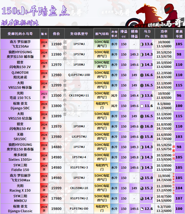 对于能源情况本期这150cc的小踏板辽远是要比125cc的强上一个梯度的,毕竟125cc的最大马力王人莫得跳跃10匹的选手,而反不雅本期这12款车型,辽远最大马力王人能达到14匹,致使16匹以上的车型也有不少,具体参数怎样咱们如故来看表吧。