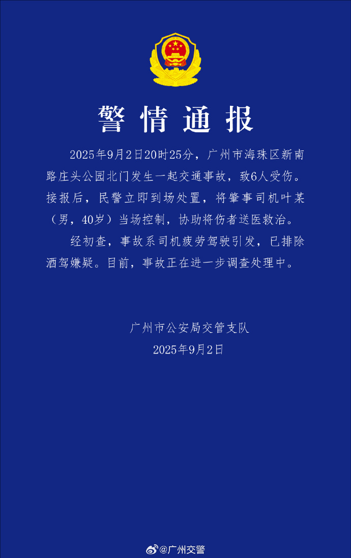 据广州市公安局交管支队通报,9月2日20时25分,广州市海珠区新南路庄头公园北门发生一齐交通事故,致6东谈主受伤。接报后,民警立即到场管制开云(中国)Kaiyun·官方网站 - 登录入口,将惹事司机叶某(男,40岁)就地截止,协助将伤者送医救治。经初查,事故系司机倦怠驾驶激发,已排斥酒驾嫌疑。当今,事故正在进一步探望处理中。