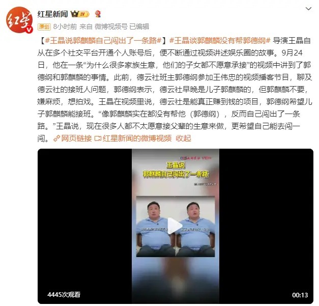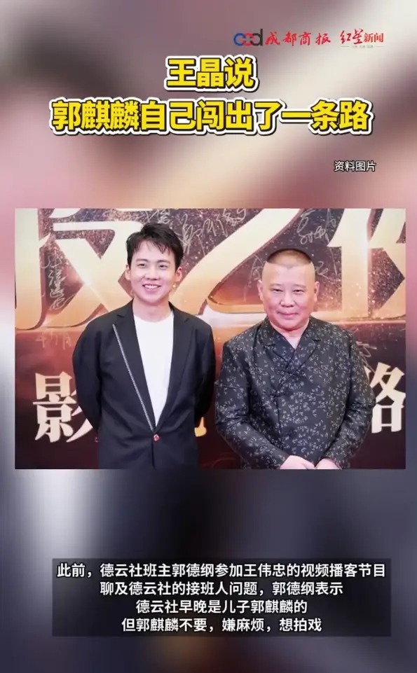 导演王晶自从在多个搪塞平台开放个东说念主账号后,便不断通过视频诠释文娱圈的故事。9月24日,他在一条“为什么许多眷属贸易,他们的子女齐不肯意相接”的视频中讲到了郭德纲和郭麒麟的事情。此前,德云社班主郭德纲投入王伟忠的视频播客节目,聊及德云社的交班东说念主问题,郭德纲默示,德云社夙夜是男儿郭麒麟的,但郭麒麟不要,嫌难题,思拍戏。