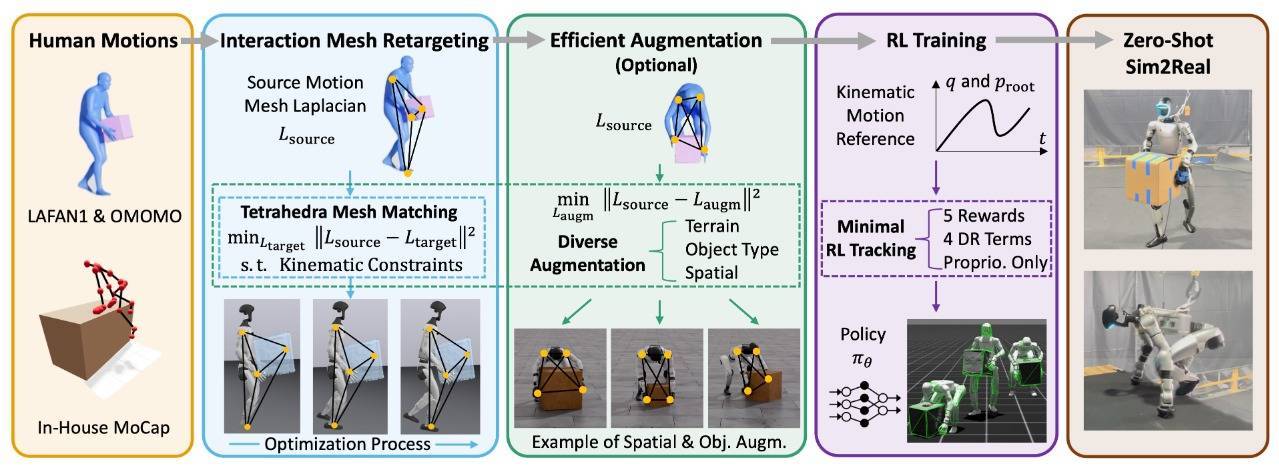 OmniRetarget 是一个基于交互网格的交互保留数据生成引擎,它明确建模并保留了智能体、地形和被操作物体之间关键的空间和战争关连。通过最小化东说念主类和机器东说念主网格之间的拉普拉斯变形,同期强制实施绽放学敛迹,OmniRetarget 生成了绽放学上可行的轨迹。